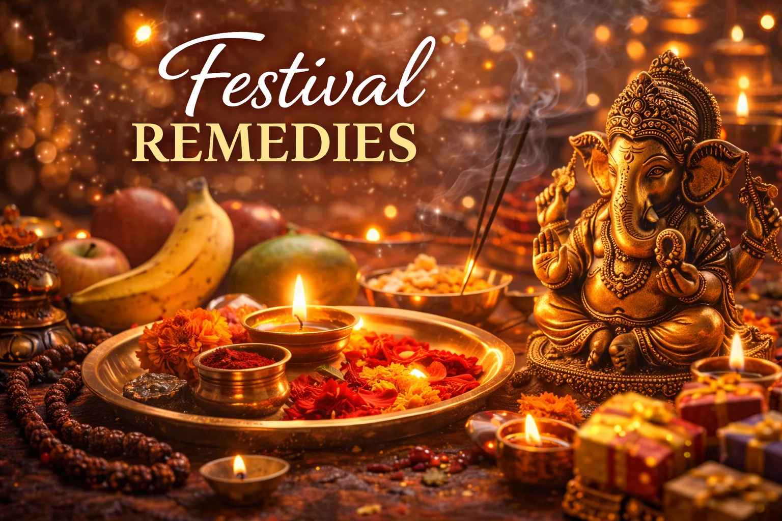 Festival remedies are simple spiritual practices performed on powerful days to strengthen positive energies. They help reduce negative influences and improve overall well-being.