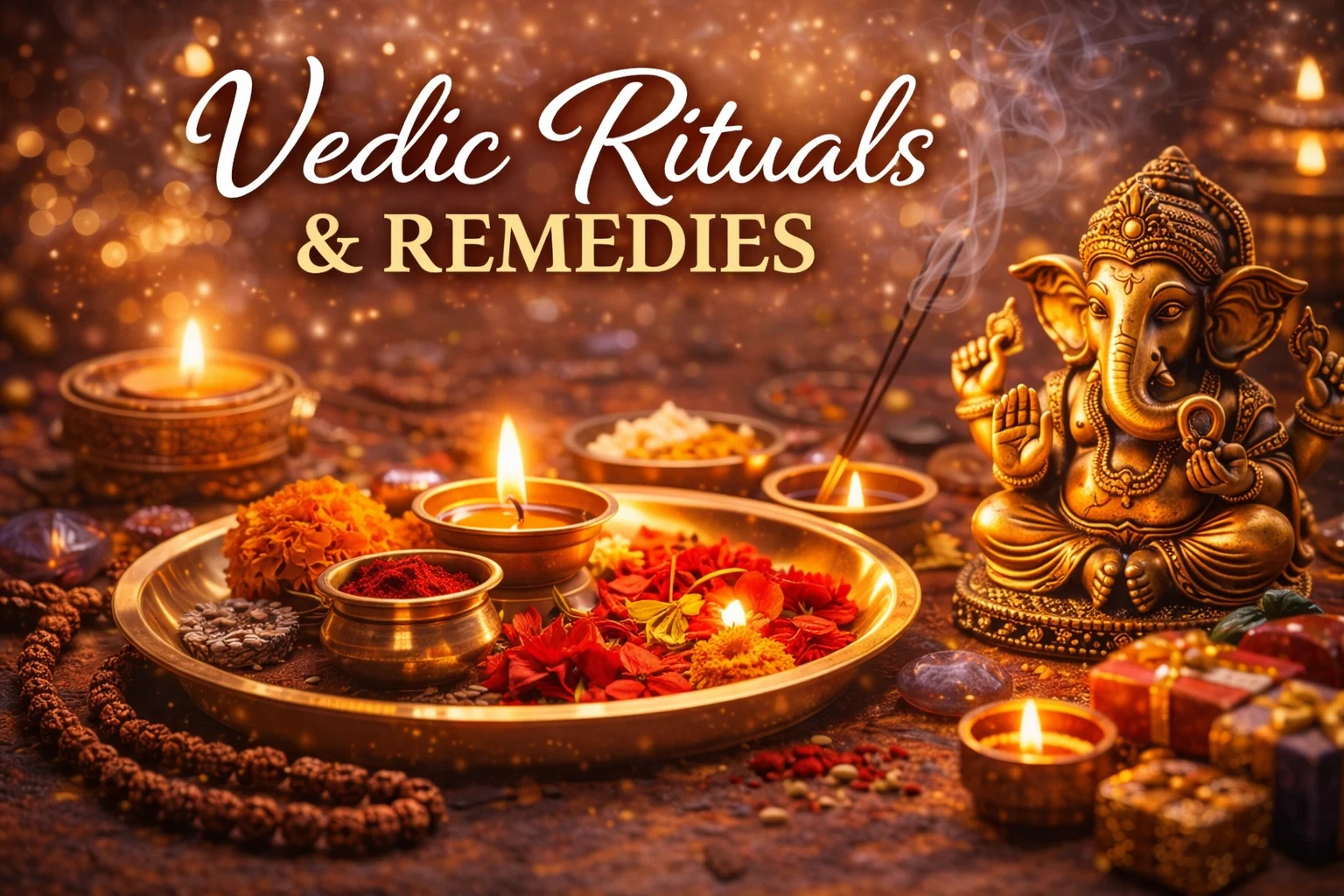 Remedies and Vedic rituals offer practical solutions for planetary imbalances and life challenges. They are performed using traditional methods to improve clarity, stability, and growth.