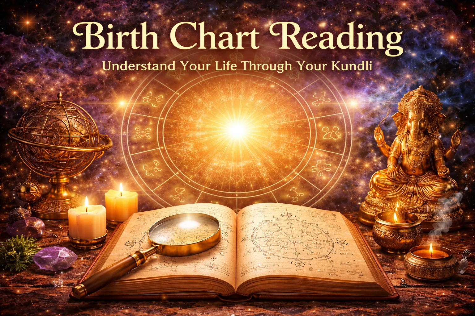 A birth chart reading, also known as Kundli analysis, examines the exact positions of the planets at the moment and place of your birth. It works like a life map written in the stars, showing how planetary energies shape your personality, decisions, opportunities, and challenges.